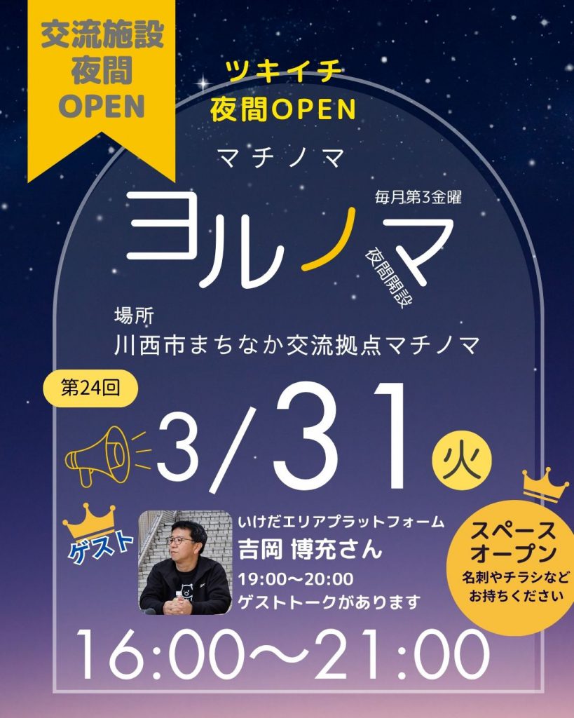 【参加者募集】🌙✨今月も、川西市のまちなか交流拠点「マチノマ」にて、夜の交流場『ヨルノマ』を開設します。